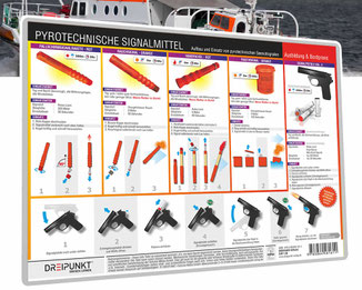 Einsatzgebiete und Funktionsdaten der Seenotsignalmittel und der Signalpistole.